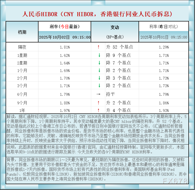 汇通财经APP讯——人民币香港银行间同业拆借利率(CNY HIBOR)及变动一览:据汇通财经观察,2025年10月2日 CNY HIBOR各周期利率变动如表格所示:3个周期利率上升,5个周期利率下降,1个周期利率持平。其中变动幅度最大的是CNY hibor的隔夜利率:升 52 个基点。如图更新的数据显示,隔夜在岸人民币HIBOR报1.81%,升52个基点;1星期报1.62%,降9个基点,2星期报1.64%,降7个基点,1个月报1.69%,降2个基点,2个月报1.70%,降3个基点,3个月报1.71%,降2个基点,6个月报1.79%,持平,9个月报1.88%,升2个基点,1年在岸人民币HIBOR报1.97%,升4个基点 。BP=基点