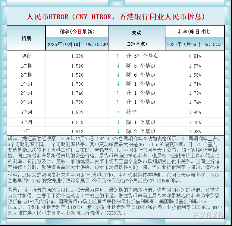 汇通财经APP讯——人民币香港银行间同业拆借利率(CNY HIBOR)及变动一览:据汇通财经观察,2025年10月10日 CNY HIBOR各周期利率变动如表格所示:3个周期利率上升,5个周期利率下降,1个周期利率持平。其中变动幅度最大的是CNY hibor的隔夜利率:升 57 个基点。如图更新的数据显示,隔夜在岸人民币HIBOR报1.38%,升57个基点;1星期报1.52%,降5个基点,2星期报1.52%,降6个基点,1个月报1.70%,降1个基点,2个月报1.74%,升1个基点,3个月报1.75%,升1个基点,6个月报1.80%,持平,9个月报1.85%,降1个基点,1年在岸人民币HIBOR报1.91%,降2个基点 。BP=基点