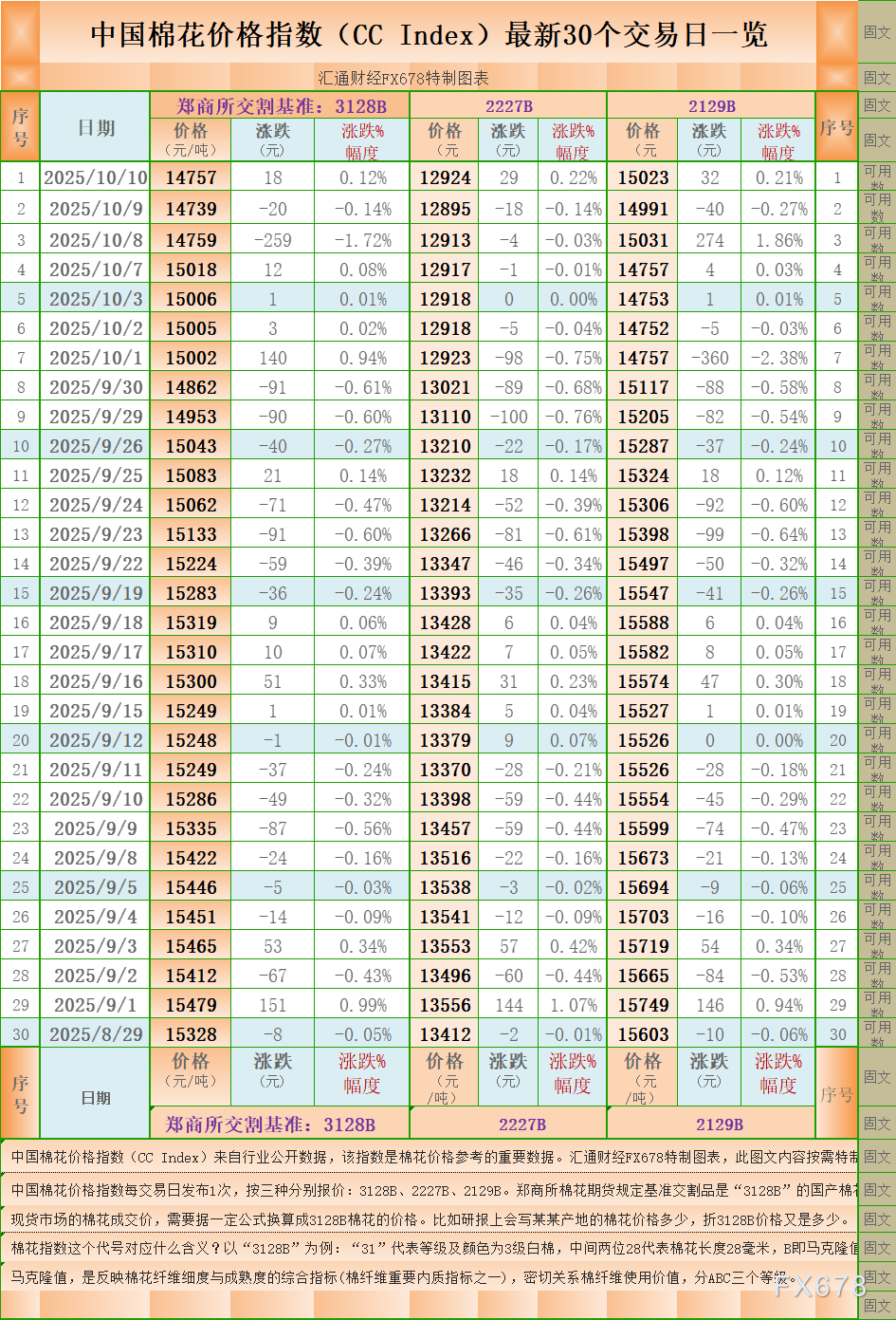汇通财经APP讯——一张图:中国棉花价格指数(CC Index)最新(2025年10月10日)数据显示,3128B棉花价格指数报 14757 元/吨(3128B是郑商所棉花期货交割认定的基准),上升18元/吨,涨0.12%,另外,2227B棉花价格指数报 12924 元/吨,上升29元/吨,涨0.22%,2129B棉花价格指数报 15023 元/吨,上升32元/吨,涨0.21%。汇通财经FX678特制图表为您展示:中国棉花价格指数(CC Index)最新30个交易日一览。( 中国棉花价格指数每交易日发布1次,按三种分别报价:3128B、2227B、2129B。郑商所棉花期货规定基准交割品是“3128B”的国产棉花。 现货市场的棉花成交价,需要据一定公式换算成3128B棉花的价格。比如研报上会写某某产地的棉花价格多少,折3128B价格又是多少。)