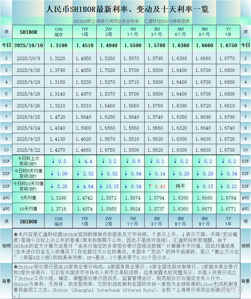 汇通财经APP讯——人民币SHIBOR(上海银行间同业拆放利率):2025年10月10日最新数据,8个周期利率下降,其中,隔夜Shibor报1.319%,降0.3个基点。各周期“变动幅度最大”的是人民币SHIBOR的1周利率:降4.4个基点。(最近十个工作日SHIBOR及变动详见汇通FX678特制图);其他周期显示,1周Shibor报1.451%,降4.4个基点。2周Shibor报1.494%,降3.2个基点。1个月Shibor报1.559%,降0.8个基点。3个月Shibor报1.578%,降0.1个基点。6个月Shibor报1.636%,降0.2个基点。9个月Shibor报1.666%,降0.2个基点。一年Shibor报1.675%,降0.2个基点。