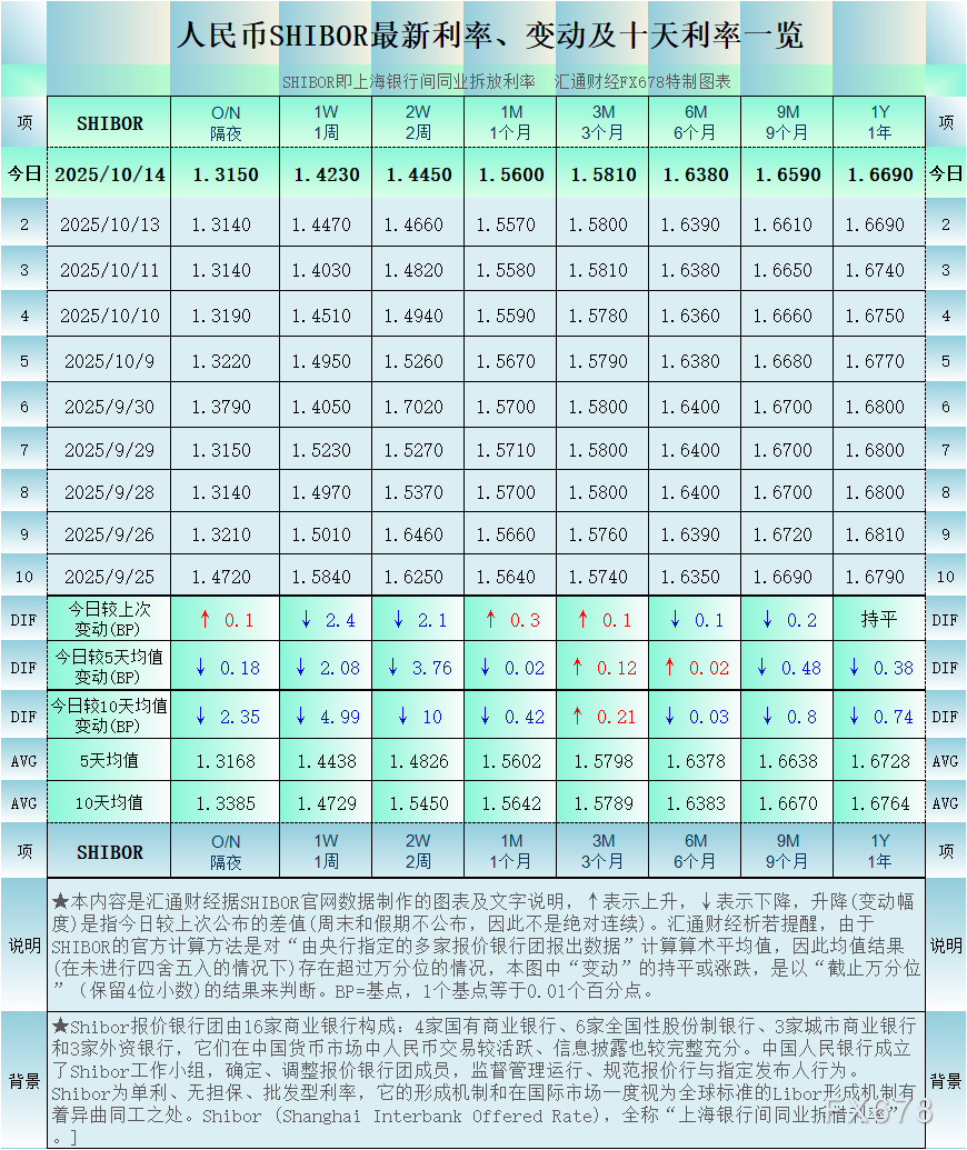 汇通财经APP讯——人民币SHIBOR(上海银行间同业拆放利率):2025年10月14日最新数据,4个周期利率下降,3个周期利率上升,1个周期利率持平,其中,隔夜Shibor报1.315%,升0.1个基点。各周期“变动幅度最大”的是人民币SHIBOR的1周利率:降2.4个基点。(最近十个工作日SHIBOR及变动详见汇通FX678特制图);其他周期显示,1周Shibor报1.423%,降2.4个基点。2周Shibor报1.445%,降2.1个基点。1个月Shibor报1.56%,升0.3个基点。3个月Shibor报1.581%,升0.1个基点。6个月Shibor报1.638%,降0.1个基点。9个月Shibor报1.659%,降0.2个基点。一年Shibor报1.669%,持平。