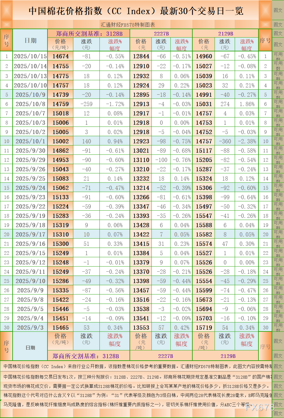 汇通财经APP讯——一张图:中国棉花价格指数(CC Index)最新(2025年10月15日)数据显示,3128B棉花价格指数报 14674 元/吨(3128B是郑商所棉花期货交割认定的基准),下降81元/吨,跌0.55%,另外,2227B棉花价格指数报 12844 元/吨,下降66元/吨,跌0.51%,2129B棉花价格指数报 14960 元/吨,下降67元/吨,跌0.45%。汇通财经FX678特制图表为您展示:中国棉花价格指数(CC Index)最新30个交易日一览。( 中国棉花价格指数每交易日发布1次,按三种分别报价:3128B、2227B、2129B。郑商所棉花期货规定基准交割品是“3128B”的国产棉花。 现货市场的棉花成交价,需要据一定公式换算成3128B棉花的价格。比如研报上会写某某产地的棉花价格多少,折3128B价格又是多少。)