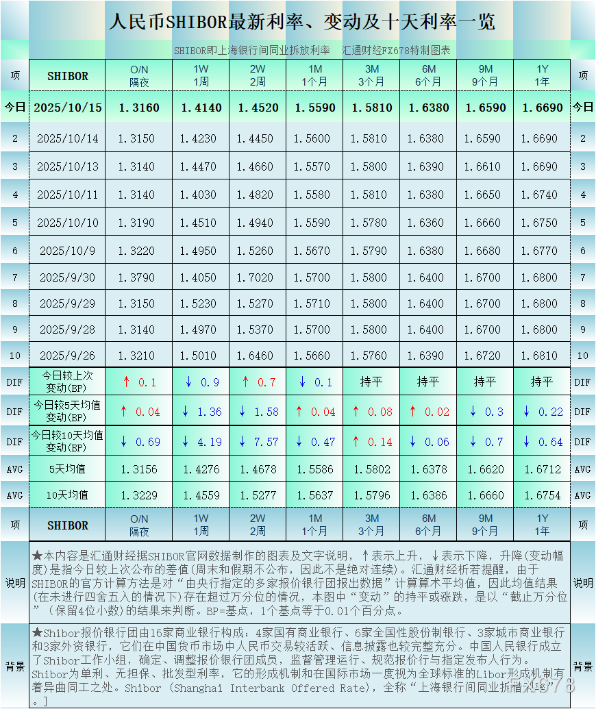 汇通财经APP讯——人民币SHIBOR(上海银行间同业拆放利率):2025年10月15日最新数据,2个周期利率下降,2个周期利率上升,4个周期利率持平,其中,隔夜Shibor报1.316%,升0.1个基点。各周期“变动幅度最大”的是人民币SHIBOR的1周利率:降0.9个基点。(最近十个工作日SHIBOR及变动详见汇通FX678特制图);其他周期显示,1周Shibor报1.414%,降0.9个基点。2周Shibor报1.452%,升0.7个基点。1个月Shibor报1.559%,降0.1个基点。3个月Shibor报1.581%,持平。6个月Shibor报1.638%,持平。9个月Shibor报1.659%,持平。一年Shibor报1.669%,持平