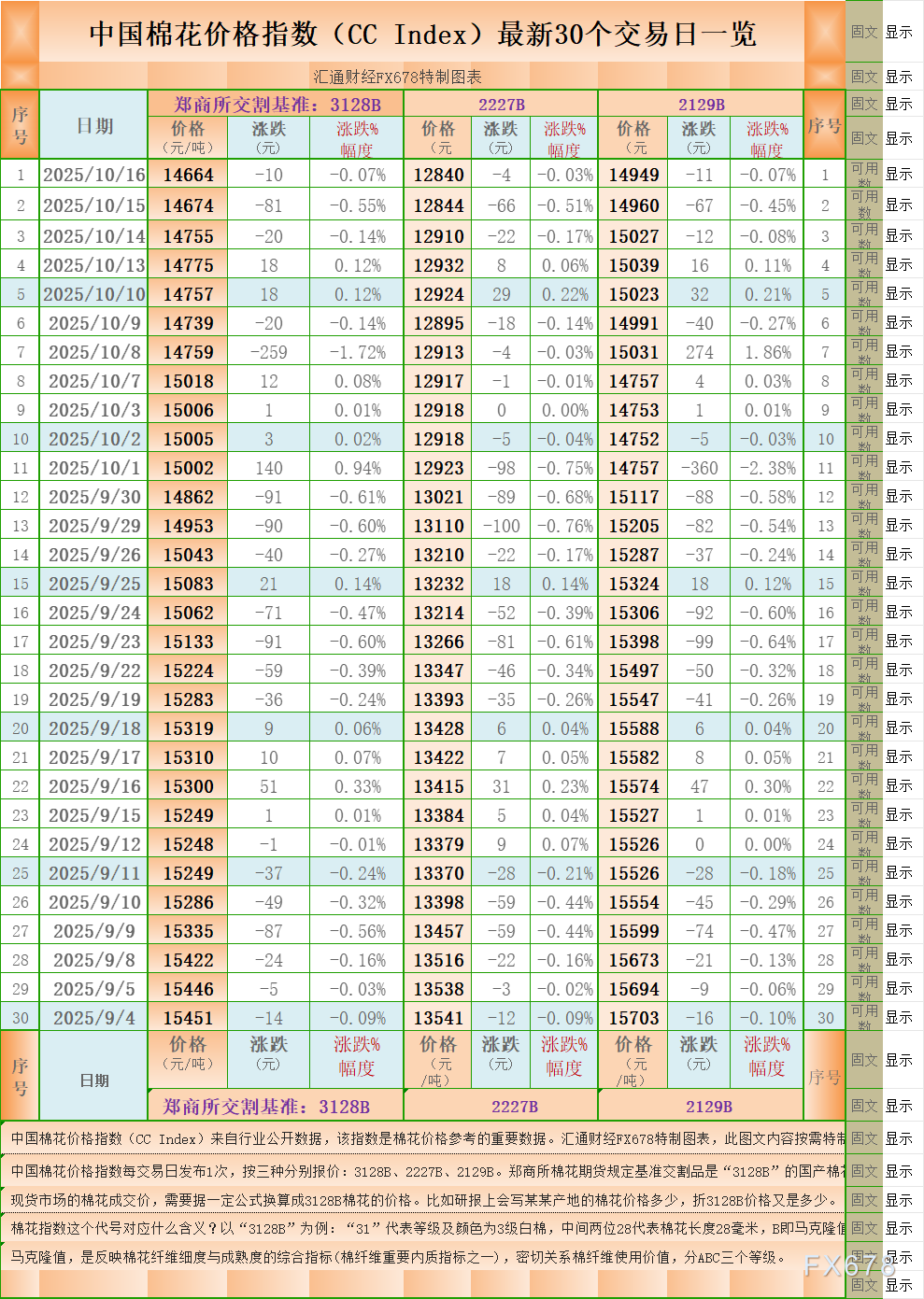 汇通财经APP讯——一张图:中国棉花价格指数(CC Index)最新(2025年10月16日)数据显示,3128B棉花价格指数报 14664 元/吨(3128B是郑商所棉花期货交割认定的基准),下降10元/吨,跌0.07%,另外,2227B棉花价格指数报 12840 元/吨,下降4元/吨,跌0.03%,2129B棉花价格指数报 14949 元/吨,下降11元/吨,跌0.07%。汇通财经FX678特制图表为您展示:中国棉花价格指数(CC Index)最新30个交易日一览。( 中国棉花价格指数每交易日发布1次,按三种分别报价:3128B、2227B、2129B。郑商所棉花期货规定基准交割品是“3128B”的国产棉花。 现货市场的棉花成交价,需要据一定公式换算成3128B棉花的价格。比如研报上会写某某产地的棉花价格多少,折3128B价格又是多少。)