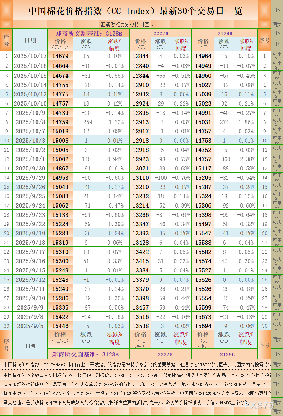 汇通财经APP讯——一张图:中国棉花价格指数(CC Index)最新(2025年10月17日)数据显示,3128B棉花价格指数报 14679 元/吨(3128B是郑商所棉花期货交割认定的基准),上升15元/吨,涨0.10%,另外,2227B棉花价格指数报 12844 元/吨,上升4元/吨,涨0.03%,2129B棉花价格指数报 14964 元/吨,上升15元/吨,涨0.10%。汇通财经FX678特制图表为您展示:中国棉花价格指数(CC Index)最新30个交易日一览。( 中国棉花价格指数每交易日发布1次,按三种分别报价:3128B、2227B、2129B。郑商所棉花期货规定基准交割品是“3128B”的国产棉花。 现货市场的棉花成交价,需要据一定公式换算成3128B棉花的价格。比如研报上会写某某产地的棉花价格多少,折3128B价格又是多少。)
