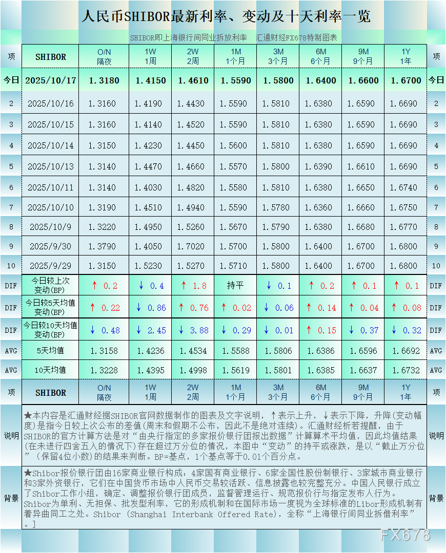 汇通财经APP讯——人民币SHIBOR(上海银行间同业拆放利率):2025年10月17日最新数据,2个周期利率下降,5个周期利率上升,1个周期利率持平,其中,隔夜Shibor报1.318%,升0.2个基点。各周期“变动幅度最大”的是人民币SHIBOR的2周利率:升1.8个基点。(最近十个工作日SHIBOR及变动详见汇通FX678特制图);其他周期显示,1周Shibor报1.415%,降0.4个基点。2周Shibor报1.461%,升1.8个基点。1个月Shibor报1.559%,持平。3个月Shibor报1.58%,降0.1个基点。6个月Shibor报1.64%,升0.2个基点。9个月Shibor报1.66%,升0.1个基点。一年Shibor报1.67%,升0.1个基点
