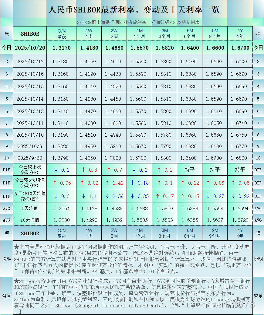 汇通财经APP讯——人民币SHIBOR(上海银行间同业拆放利率):2025年10月20日最新数据,2个周期利率下降,3个周期利率上升,3个周期利率持平,其中,隔夜Shibor报1.317%,降0.1个基点。各周期“变动幅度最大”的是人民币SHIBOR的2周利率:升0.7个基点。(最近十个工作日SHIBOR及变动详见汇通FX678特制图);其他周期显示,1周Shibor报1.418%,升0.3个基点。2周Shibor报1.468%,升0.7个基点。1个月Shibor报1.557%,降0.2个基点。3个月Shibor报1.582%,升0.2个基点。6个月Shibor报1.64%,持平。9个月Shibor报1.66%,持平。一年Shibor报1.67%,持平。