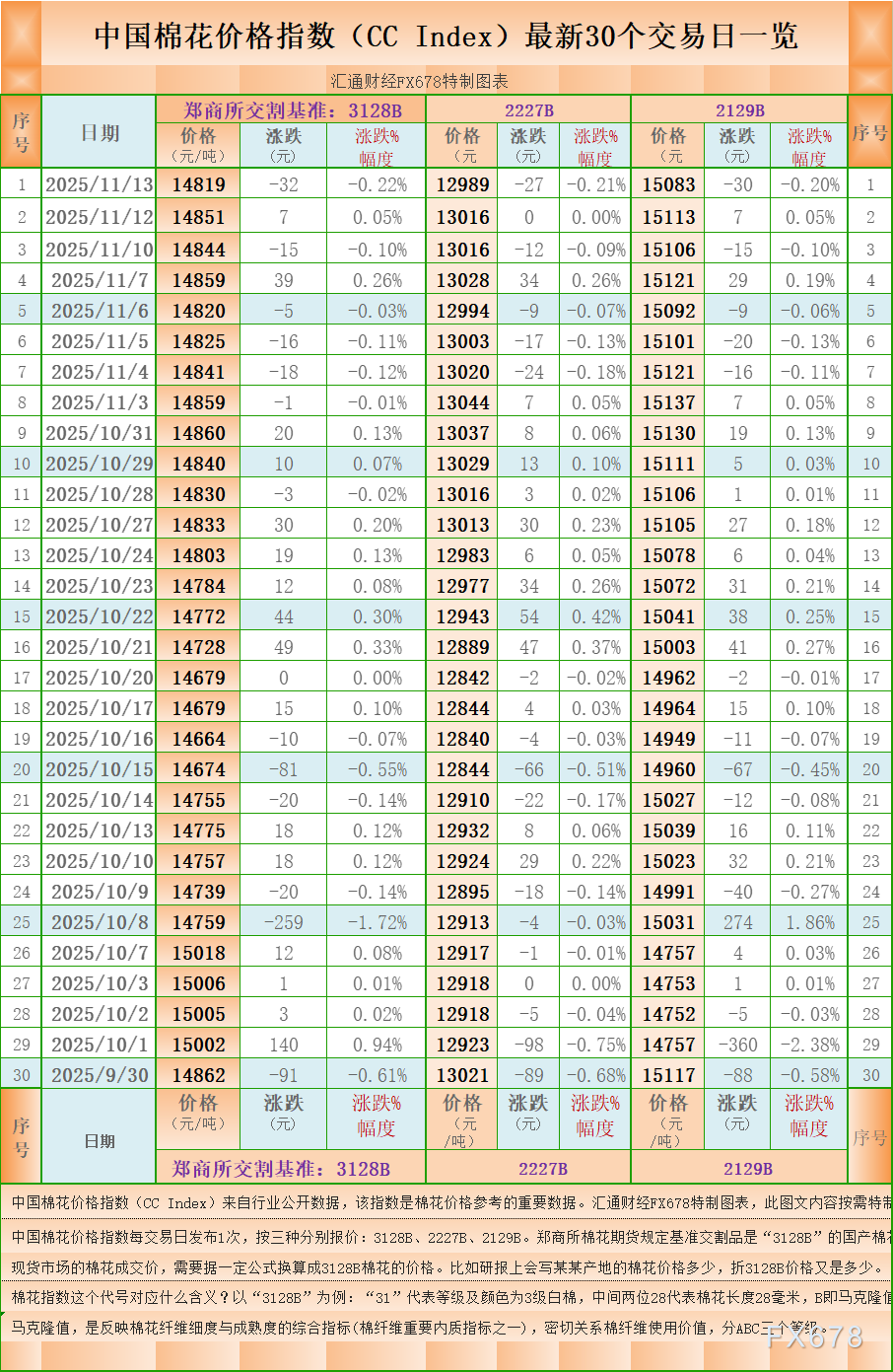 汇通财经APP讯——一张图:中国棉花价格指数(CC Index)最新(2025年11月13日)数据显示,3128B棉花价格指数报 14819 元/吨(3128B是郑商所棉花期货交割认定的基准),下降32元/吨,跌0.22%,另外,2227B棉花价格指数报 12989 元/吨,下降27元/吨,跌0.21%,2129B棉花价格指数报 15083 元/吨,下降30元/吨,跌0.20%。汇通财经FX678特制图表为您展示:中国棉花价格指数(CC Index)最新30个交易日一览。( 中国棉花价格指数每交易日发布1次,按三种分别报价:3128B、2227B、2129B。郑商所棉花期货规定基准交割品是“3128B”的国产棉花。 现货市场的棉花成交价,需要据一定公式换算成3128B棉花的价格。比如研报上会写某某产地的棉花价格多少,折3128B价格又是多少。)