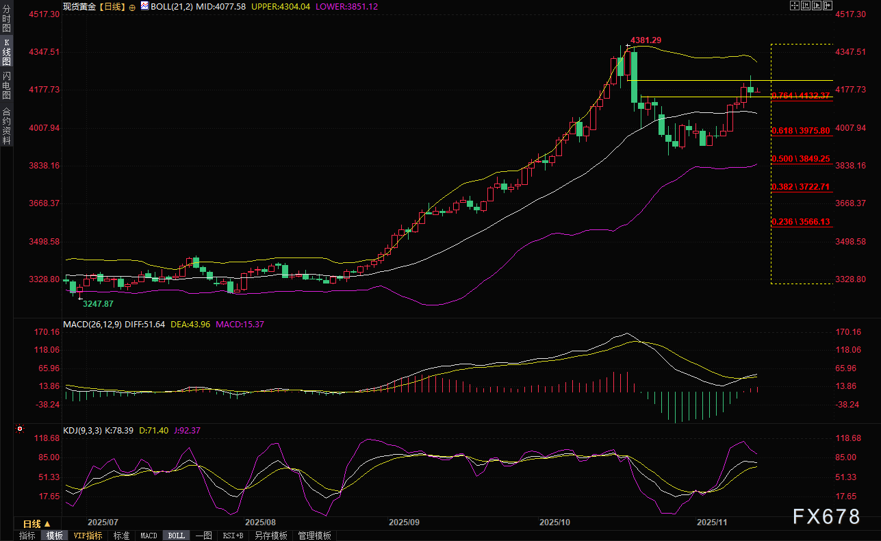 2、鉴于目前MACD金叉运行,KDJ金叉信号仍在,如果金价坚守在4145上方,则后市留有继续震荡走高的机会,目标有望看向布林线上轨4305附近位置,隔夜高点4242附近位置阻力也需要予以留意。
