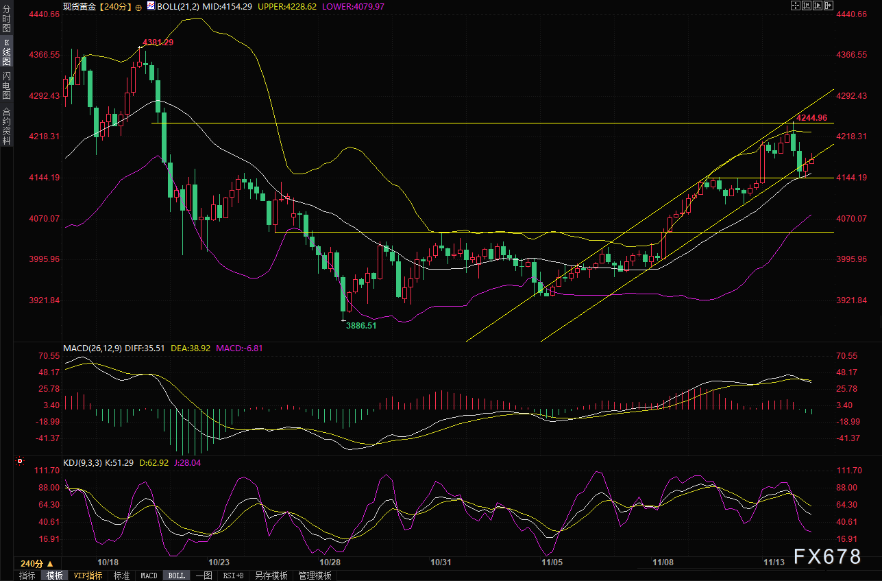 2、上方9均线阻力在4192附近,然后是4200关口,鉴于目前金价在布林线中轨附近获得支撑,如果金价能够收复4200关口,这将意味着近期涨势延续,后市有望再度向布林线上轨4229附近位置发起冲击,并有望延伸至近期上涨通道上轨,目前大约在4285附近。
