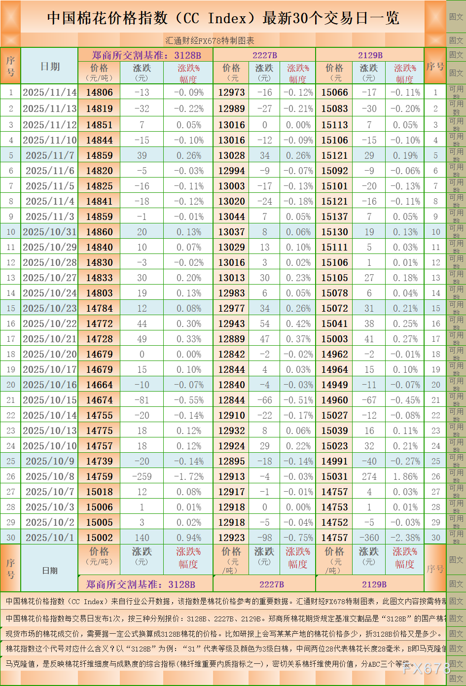 汇通财经APP讯——一张图:中国棉花价格指数(CC Index)最新(2025年11月14日)数据显示,3128B棉花价格指数报 14806 元/吨(3128B是郑商所棉花期货交割认定的基准),下降13元/吨,跌0.09%,另外,2227B棉花价格指数报 12973 元/吨,下降16元/吨,跌0.12%,2129B棉花价格指数报 15066 元/吨,下降17元/吨,跌0.11%。汇通财经FX678特制图表为您展示:中国棉花价格指数(CC Index)最新30个交易日一览。( 中国棉花价格指数每交易日发布1次,按三种分别报价:3128B、2227B、2129B。郑商所棉花期货规定基准交割品是“3128B”的国产棉花。 现货市场的棉花成交价,需要据一定公式换算成3128B棉花的价格。比如研报上会写某某产地的棉花价格多少,折3128B价格又是多少。)