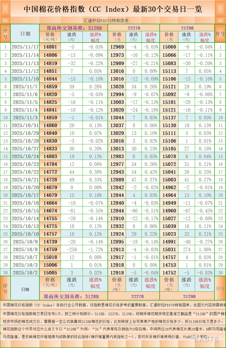 汇通财经APP讯——一张图:中国棉花价格指数(CC Index)最新(2025年11月17日)数据显示,3128B棉花价格指数报 14801 元/吨(3128B是郑商所棉花期货交割认定的基准),下降5元/吨,跌0.03%,另外,2227B棉花价格指数报 12969 元/吨,下降4元/吨,跌0.03%,2129B棉花价格指数报 15060 元/吨,下降6元/吨,跌0.04%。汇通财经FX678特制图表为您展示:中国棉花价格指数(CC Index)最新30个交易日一览。( 中国棉花价格指数每交易日发布1次,按三种分别报价:3128B、2227B、2129B。郑商所棉花期货规定基准交割品是“3128B”的国产棉花。 现货市场的棉花成交价,需要据一定公式换算成3128B棉花的价格。比如研报上会写某某产地的棉花价格多少,折3128B价格又是多少。)