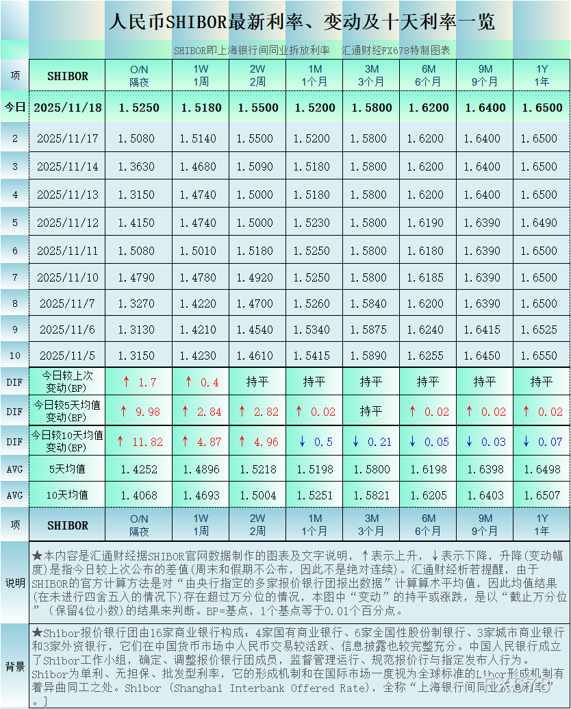 汇通财经APP讯——人民币SHIBOR(上海银行间同业拆放利率):2025年11月18日最新数据,2个周期利率上升,6个周期利率持平,其中,隔夜Shibor报1.525%,升1.7个基点。各周期“变动幅度最大”的是人民币SHIBOR的隔夜利率:升1.7个基点。(最近十个工作日SHIBOR及变动详见汇通FX678特制图);其他周期显示,1周Shibor报1.518%,升0.4个基点。2周Shibor报1.55%,持平。1个月Shibor报1.52%,持平。3个月Shibor报1.58%,持平。6个月Shibor报1.62%,持平。9个月Shibor报1.64%,持平。一年Shibor报1.65%,持平。