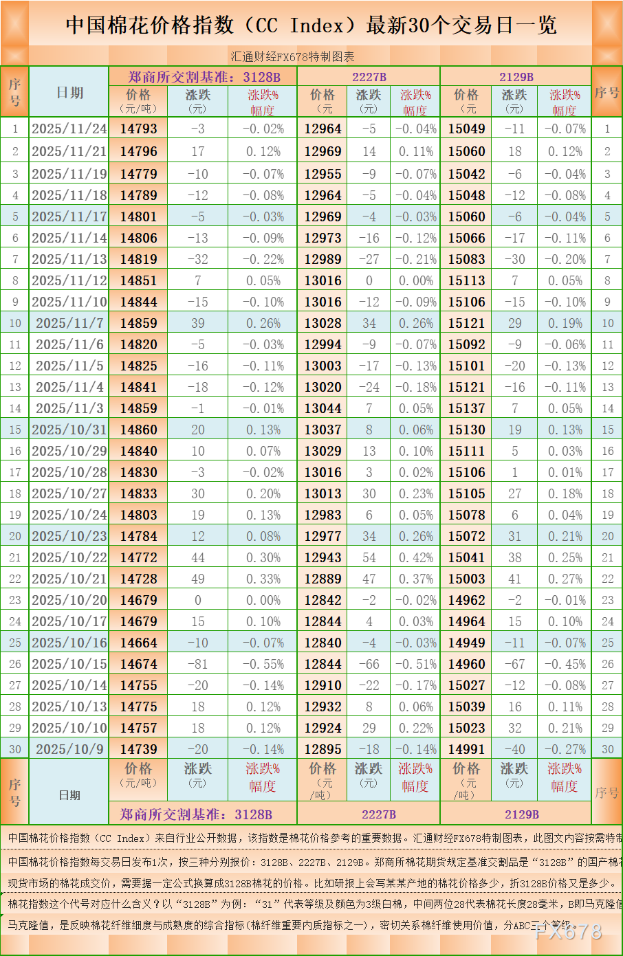汇通财经APP讯——一张图:中国棉花价格指数(CC Index)最新(2025年11月24日)数据显示,3128B棉花价格指数报 14793 元/吨(3128B是郑商所棉花期货交割认定的基准),下降3元/吨,跌0.02%,另外,2227B棉花价格指数报 12964 元/吨,下降5元/吨,跌0.04%,2129B棉花价格指数报 15049 元/吨,下降11元/吨,跌0.07%。汇通财经FX678特制图表为您展示:中国棉花价格指数(CC Index)最新30个交易日一览。( 中国棉花价格指数每交易日发布1次,按三种分别报价:3128B、2227B、2129B。郑商所棉花期货规定基准交割品是“3128B”的国产棉花。 现货市场的棉花成交价,需要据一定公式换算成3128B棉花的价格。比如研报上会写某某产地的棉花价格多少,折3128B价格又是多少。)
