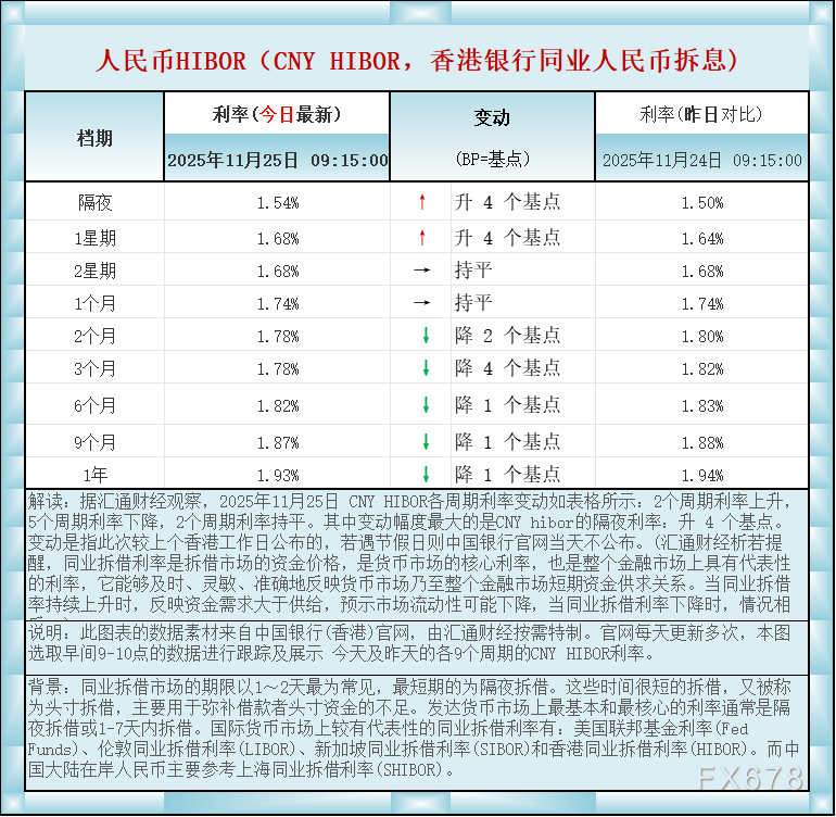 汇通财经APP讯——人民币香港银行间同业拆借利率(CNY HIBOR)及变动一览:据汇通财经观察,2025年11月25日 CNY HIBOR各周期利率变动如表格所示:2个周期利率上升,5个周期利率下降,2个周期利率持平。其中变动幅度最大的是CNY hibor的隔夜利率:升 4 个基点。如图更新的数据显示,隔夜在岸人民币HIBOR报1.54%,升4个基点;1星期报1.68%,升4个基点,2星期报1.68%,持平,1个月报1.74%,持平,2个月报1.78%,降2个基点,3个月报1.78%,降4个基点,6个月报1.82%,降1个基点,9个月报1.87%,降1个基点,1年在岸人民币HIBOR报1.93%,降1个基点 。BP=基点