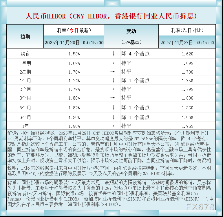 汇通财经APP讯——人民币香港银行间同业拆借利率(CNY HIBOR)及变动一览:据汇通财经观察,2025年11月28日 CNY HIBOR各周期利率变动如表格所示:0个周期利率上升,4个周期利率下降,5个周期利率持平。其中变动幅度最大的是CNY hibor的隔夜利率:降 4 个基点。如图更新的数据显示,隔夜在岸人民币HIBOR报1.58%,降4个基点;1星期报1.69%,持平,2星期报1.70%,持平,1个月报1.74%,降1个基点,2个月报1.79%,持平,3个月报1.80%,持平,6个月报1.82%,降1个基点,9个月报1.89%,降1个基点,1年在岸人民币HIBOR报1.96%,持平 。BP=基点