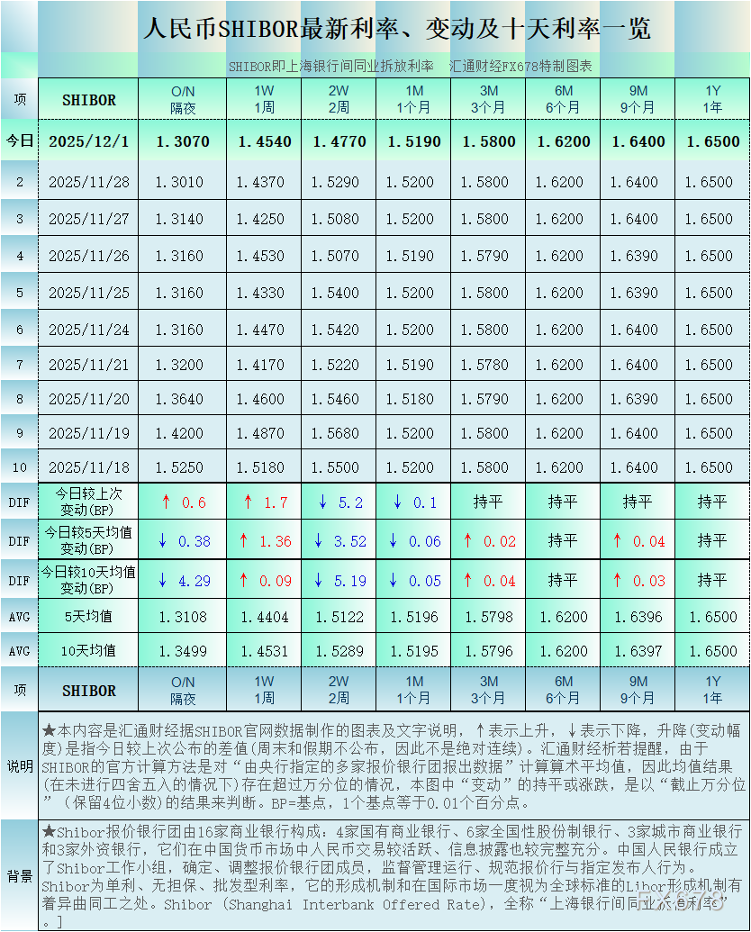 汇通财经APP讯——人民币SHIBOR(上海银行间同业拆放利率):2025年12月1日最新数据,2个周期利率下降,2个周期利率上升,4个周期利率持平,其中,隔夜Shibor报1.307%,升0.6个基点。各周期“变动幅度最大”的是人民币SHIBOR的2周利率:降5.2个基点。(最近十个工作日SHIBOR及变动详见汇通FX678特制图);其他周期显示,1周Shibor报1.454%,升1.7个基点。2周Shibor报1.477%,降5.2个基点。1个月Shibor报1.519%,降0.1个基点。3个月Shibor报1.58%,持平。6个月Shibor报1.62%,持平。9个月Shibor报1.64%,持平。一年Shibor报1.65%,持平。
