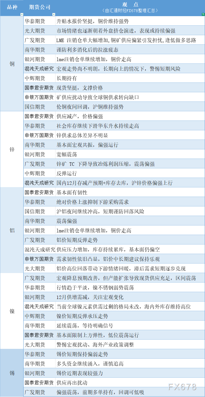 沪锌:隔夜沪锌偏强震荡。宏观面,美国上周首申失业金人数下滑,美联储官员继续表态支持降息,宏观情绪偏强。基本面看,国产TC 仍处于下滑通道,部分地区报价已来到1800 左右。供应端,据百川盈孚统计,12 月冶炼厂预计环比录减超 3 万吨,供应压力持续放缓。需求端,下游逢低采买为主,昨日升水小幅上行,社库延续去化。整体而言,短时向上驱动相比上轮未有增加,预计高位震荡为主,测试前高压力有效性。