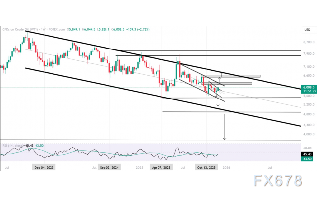 2、当前,油价正试图持稳于60.00美元这一关键突破位上方。短期上行的首要测试目标是62.60美元附近,即6个月下跌通道的上轨。若周线能强势收盘于该阻力之上,则可能进一步打开上行空间,中期目标指向长期大通道的上轨66.40美元,并有望挑战70.00美元整数关口。这将构成潜在长期趋势反转的早期信号。