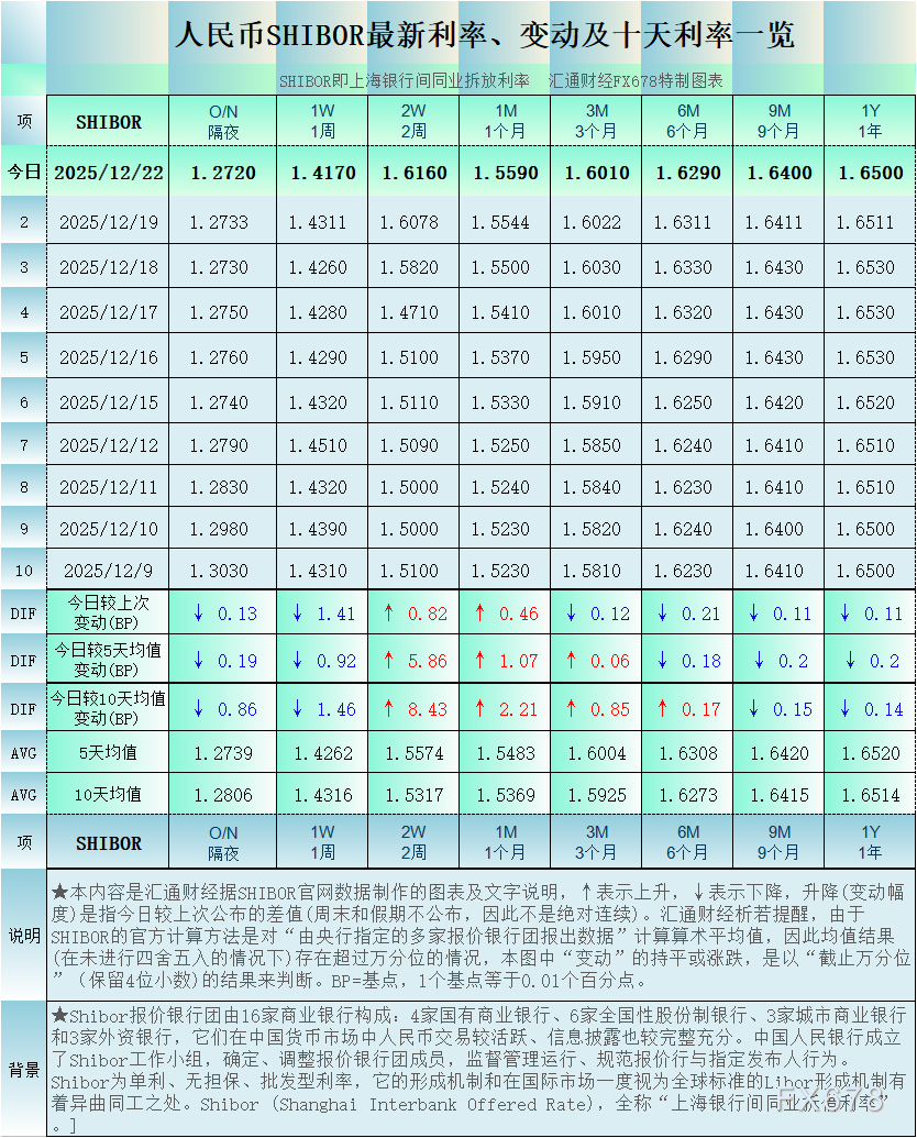 汇通财经APP讯——人民币SHIBOR(上海银行间同业拆放利率):2025年12月22日最新数据,6个周期利率下降,2个周期利率上升,其中,隔夜Shibor报1.272%,降0.13个基点。各周期“变动幅度最大”的是人民币SHIBOR的1周利率:降1.41个基点。(最近十个工作日SHIBOR及变动详见汇通FX678特制图);其他周期显示,1周Shibor报1.417%,降1.41个基点。2周Shibor报1.616%,升0.82个基点。1个月Shibor报1.559%,升0.46个基点。3个月Shibor报1.601%,降0.12个基点。6个月Shibor报1.629%,降0.21个基点。9个月Shibor报1.64%,降0.11个基点。一年Shibor报1.65%,降0.11个基点