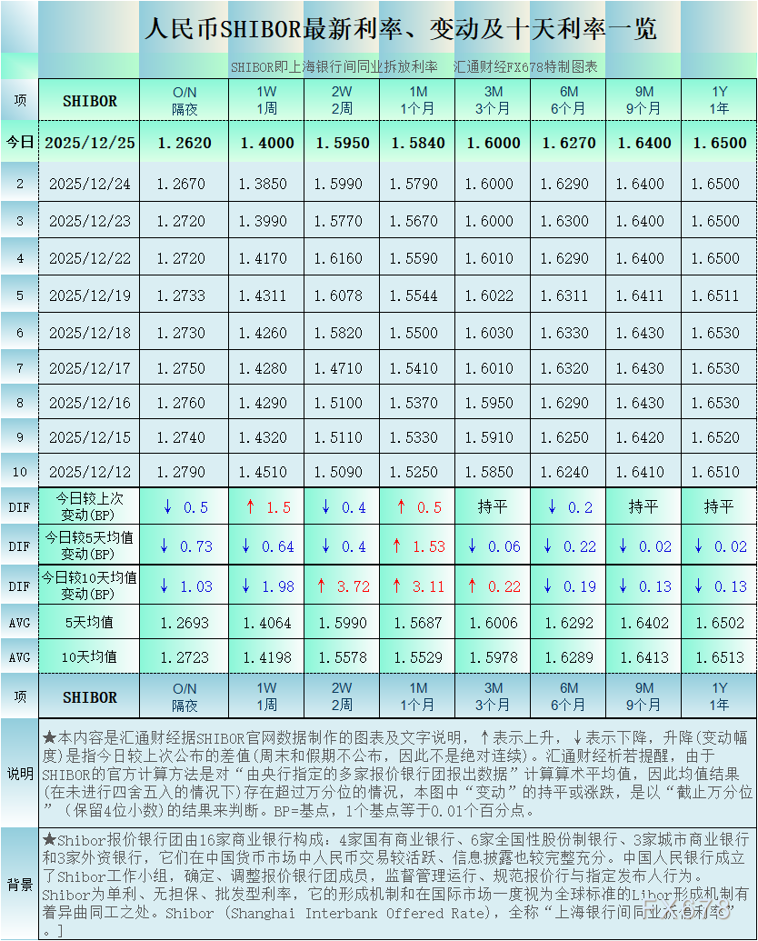 汇通财经APP讯——人民币SHIBOR(上海银行间同业拆放利率):2025年12月25日最新数据,3个周期利率下降,2个周期利率上升,3个周期利率持平,其中,隔夜Shibor报1.262%,降0.5个基点。各周期“变动幅度最大”的是人民币SHIBOR的1周利率:升1.5个基点。(最近十个工作日SHIBOR及变动详见汇通FX678特制图);其他周期显示,1周Shibor报1.4%,升1.5个基点。2周Shibor报1.595%,降0.4个基点。1个月Shibor报1.584%,升0.5个基点。3个月Shibor报1.6%,持平。6个月Shibor报1.627%,降0.2个基点。9个月Shibor报1.64%,持平。一年Shibor报1.65%,持平。