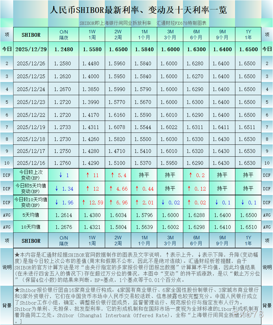 汇通财经APP讯——(人民币SHIBOR(上海银行间同业拆放利率):2025年12月29日最新数据,1个周期利率下降,3个周期利率上升,4个周期利率持平,其中,隔夜Shibor报1.248%,降1个基点。各周期“变动幅度最大”的是人民币SHIBOR的1周利率:升11个基点。(最近十个工作日SHIBOR及变动详见汇通FX678特制图);其他周期显示,1周Shibor报1.558%,升11个基点。2周Shibor报1.65%,升5.4个基点。1个月Shibor报1.584%,持平。3个月Shibor报1.6%,持平。6个月Shibor报1.63%,升0.2个基点。9个月Shibor报1.64%,持平。一年Shibor报1.65%,持平