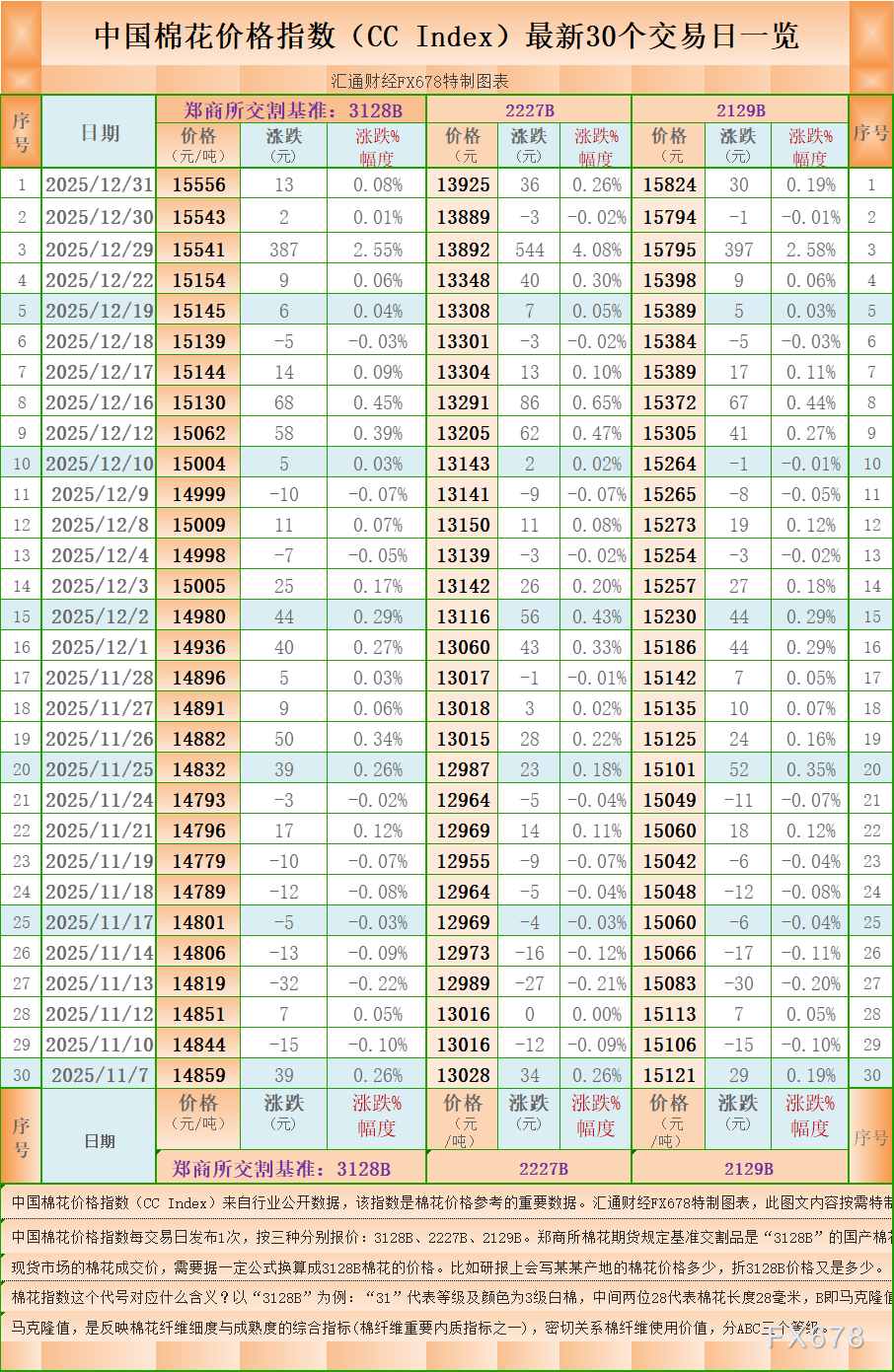 汇通财经APP讯——一张图:中国棉花价格指数(CC Index)最新(2025年12月31日)数据显示,3128B棉花价格指数报 15556 元/吨(3128B是郑商所棉花期货交割认定的基准),上升13元/吨,涨0.08%,另外,2227B棉花价格指数报 13925 元/吨,上升36元/吨,涨0.26%,2129B棉花价格指数报 15824 元/吨,上升30元/吨,涨0.19%。汇通财经FX678特制图表为您展示:中国棉花价格指数(CC Index)最新30个交易日一览。( 中国棉花价格指数每交易日发布1次,按三种分别报价:3128B、2227B、2129B。郑商所棉花期货规定基准交割品是“3128B”的国产棉花。 现货市场的棉花成交价,需要据一定公式换算成3128B棉花的价格。比如研报上会写某某产地的棉花价格多少,折3128B价格又是多少。)