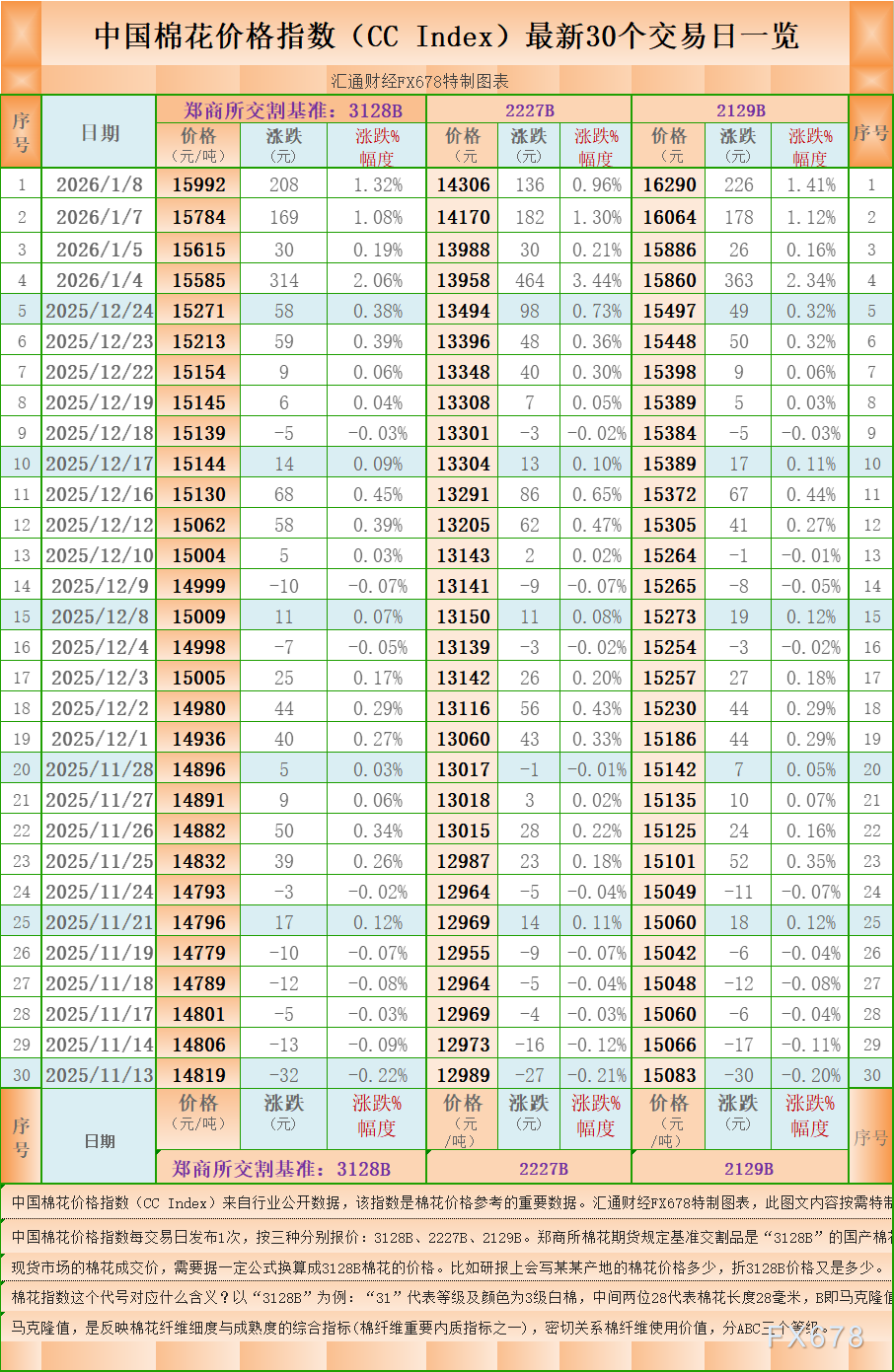 汇通财经APP讯——一张图:中国棉花价格指数(CC Index)最新(2026年1月8日)数据显示,3128B棉花价格指数报 15992 元/吨(3128B是郑商所棉花期货交割认定的基准),上升208元/吨,涨1.32%,另外,2227B棉花价格指数报 14306 元/吨,上升136元/吨,涨0.96%,2129B棉花价格指数报 16290 元/吨,上升226元/吨,涨1.41%。汇通财经FX678特制图表为您展示:中国棉花价格指数(CC Index)最新30个交易日一览。( 中国棉花价格指数每交易日发布1次,按三种分别报价:3128B、2227B、2129B。郑商所棉花期货规定基准交割品是“3128B”的国产棉花。 现货市场的棉花成交价,需要据一定公式换算成3128B棉花的价格。比如研报上会写某某产地的棉花价格多少,折3128B价格又是多少。)