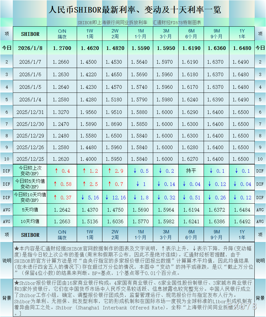 汇通财经APP讯——人民币SHIBOR(上海银行间同业拆放利率):2026年1月8日最新数据,4个周期利率下降,3个周期利率上升,1个周期利率持平,其中,隔夜Shibor报1.27%,升0.4个基点。各周期“变动幅度最大”的是人民币SHIBOR的2周利率:升2.9个基点。(最近十个工作日SHIBOR及变动详见汇通FX678特制图);其他周期显示,1周Shibor报1.462%,升1.2个基点。2周Shibor报1.482%,升2.9个基点。1个月Shibor报1.559%,降0.5个基点。3个月Shibor报1.595%,降0.2个基点。6个月Shibor报1.619%,持平。9个月Shibor报1.636%,降0.1个基点。一年Shibor报1.648%,降0.1个基点
