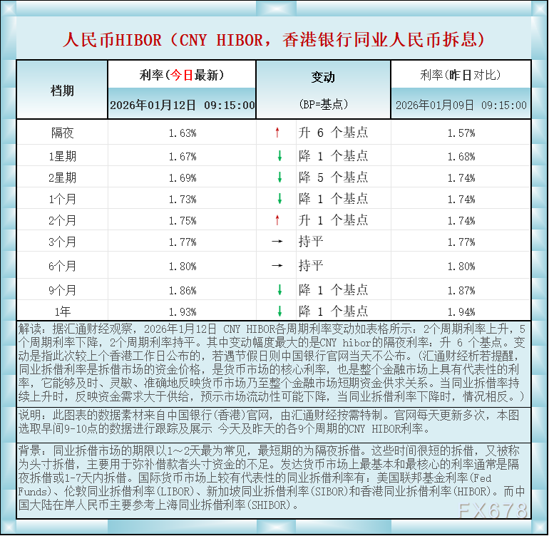 汇通财经APP讯——人民币香港银行间同业拆借利率(CNY HIBOR)及变动一览:据汇通财经观察,2026年1月12日 CNY HIBOR各周期利率变动如表格所示:2个周期利率上升,5个周期利率下降,2个周期利率持平。其中变动幅度最大的是CNY hibor的隔夜利率:升 6 个基点。如图更新的数据显示,隔夜在岸人民币HIBOR报1.63%,升6个基点;1星期报1.67%,降1个基点,2星期报1.69%,降5个基点,1个月报1.73%,降1个基点,2个月报1.75%,升1个基点,3个月报1.77%,持平,6个月报1.80%,持平,9个月报1.86%,降1个基点,1年在岸人民币HIBOR报1.93%,降1个基点 。BP=基点