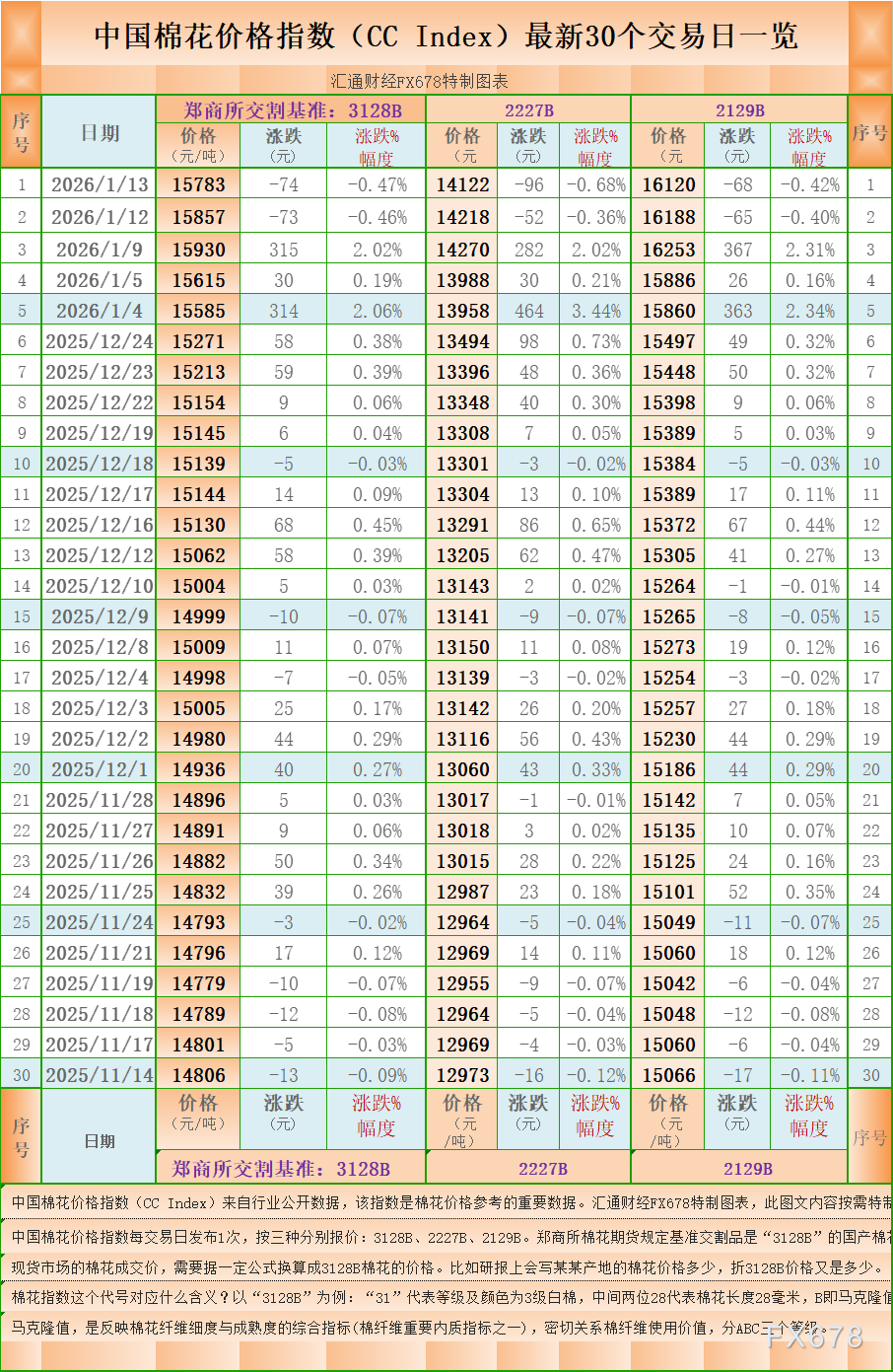 汇通财经APP讯——一张图:中国棉花价格指数(CC Index)最新(2026年1月13日)数据显示,3128B棉花价格指数报 15783 元/吨(3128B是郑商所棉花期货交割认定的基准),下降74元/吨,跌0.47%,另外,2227B棉花价格指数报 14122 元/吨,下降96元/吨,跌0.68%,2129B棉花价格指数报 16120 元/吨,下降68元/吨,跌0.42%。汇通财经FX678特制图表为您展示:中国棉花价格指数(CC Index)最新30个交易日一览。( 中国棉花价格指数每交易日发布1次,按三种分别报价:3128B、2227B、2129B。郑商所棉花期货规定基准交割品是“3128B”的国产棉花。 现货市场的棉花成交价,需要据一定公式换算成3128B棉花的价格。比如研报上会写某某产地的棉花价格多少,折3128B价格又是多少。)