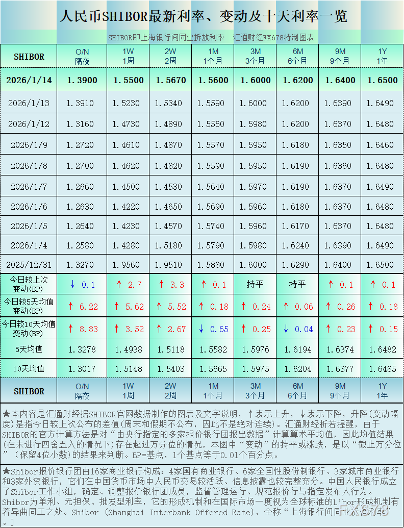 汇通财经APP讯——人民币SHIBOR(上海银行间同业拆放利率):2026年1月14日最新数据,1个周期利率下降,5个周期利率上升,2个周期利率持平,其中,隔夜Shibor报1.39%,降0.1个基点。各周期“变动幅度最大”的是人民币SHIBOR的2周利率:升3.3个基点。(最近十个工作日SHIBOR及变动详见汇通FX678特制图);其他周期显示,1周Shibor报1.55%,升2.7个基点。2周Shibor报1.567%,升3.3个基点。1个月Shibor报1.56%,升0.1个基点。3个月Shibor报1.6%,持平。6个月Shibor报1.62%,持平。9个月Shibor报1.64%,升0.1个基点。一年Shibor报1.65%,升0.1个基点。