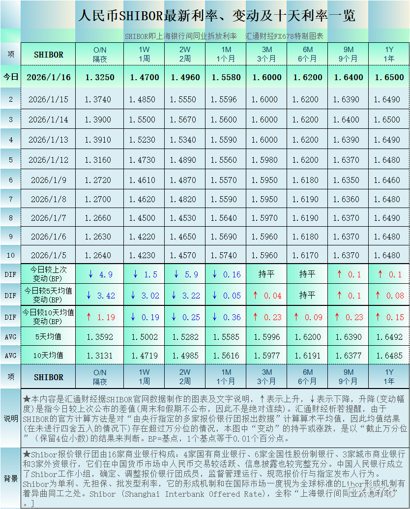 汇通财经APP讯——人民币SHIBOR(上海银行间同业拆放利率):2026年1月16日最新数据,4个周期利率下降,2个周期利率上升,2个周期利率持平,其中,隔夜Shibor报1.325%,降4.9个基点。各周期“变动幅度最大”的是人民币SHIBOR的2周利率:降5.9个基点。(最近十个工作日SHIBOR及变动详见汇通FX678特制图);其他周期显示,1周Shibor报1.47%,降1.5个基点。2周Shibor报1.496%,降5.9个基点。1个月Shibor报1.558%,降0.16个基点。3个月Shibor报1.6%,持平。6个月Shibor报1.62%,持平。9个月Shibor报1.64%,升0.1个基点。一年Shibor报1.65%,升0.1个基点。
