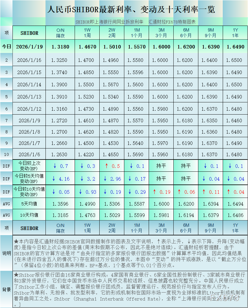 汇通财经APP讯——人民币SHIBOR(上海银行间同业拆放利率):2026年1月19日最新数据,5个周期利率下降,1个周期利率上升,2个周期利率持平,其中,隔夜Shibor报1.318%,降0.7个基点。各周期“变动幅度最大”的是人民币SHIBOR的隔夜利率:降0.7个基点。(最近十个工作日SHIBOR及变动详见汇通FX678特制图);其他周期显示,1周Shibor报1.467%,降0.3个基点。2周Shibor报1.501%,升0.5个基点。1个月Shibor报1.557%,降0.1个基点。3个月Shibor报1.6%,持平。6个月Shibor报1.62%,持平。9个月Shibor报1.639%,降0.1个基点。一年Shibor报1.649%,降0.1个基点。