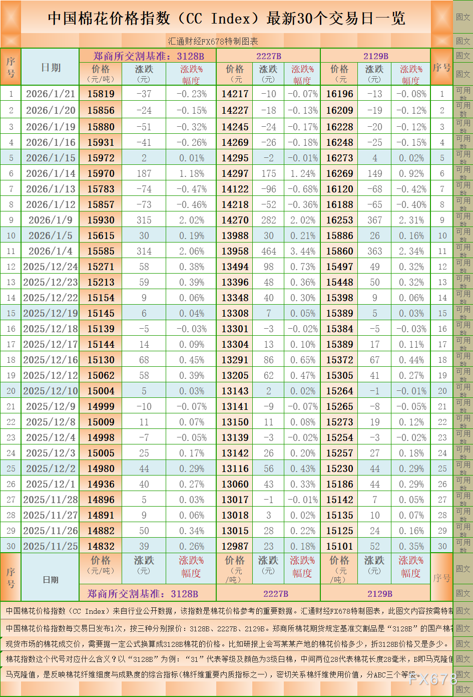 汇通财经APP讯——一张图:中国棉花价格指数(CC Index)最新(2026年1月21日)数据显示,3128B棉花价格指数报 15819 元/吨(3128B是郑商所棉花期货交割认定的基准),下降37元/吨,跌0.23%,另外,2227B棉花价格指数报 14217 元/吨,下降10元/吨,跌0.07%,2129B棉花价格指数报 16196 元/吨,下降13元/吨,跌0.08%。汇通财经FX678特制图表为您展示:中国棉花价格指数(CC Index)最新30个交易日一览。( 中国棉花价格指数每交易日发布1次,按三种分别报价:3128B、2227B、2129B。郑商所棉花期货规定基准交割品是“3128B”的国产棉花。 现货市场的棉花成交价,需要据一定公式换算成3128B棉花的价格。比如研报上会写某某产地的棉花价格多少,折3128B价格又是多少。)