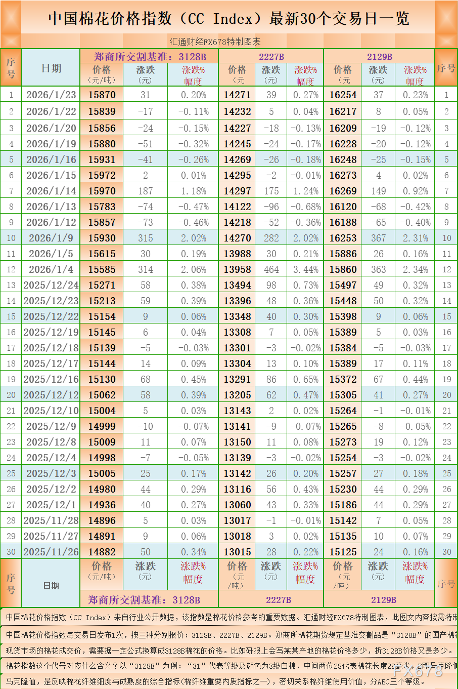 汇通财经APP讯——一张图:中国棉花价格指数(CC Index)最新(2026年1月23日)数据显示,3128B棉花价格指数报 15870 元/吨(3128B是郑商所棉花期货交割认定的基准),上升31元/吨,涨0.20%,另外,2227B棉花价格指数报 14271 元/吨,上升39元/吨,涨0.27%,2129B棉花价格指数报 16254 元/吨,上升37元/吨,涨0.23%。汇通财经FX678特制图表为您展示:中国棉花价格指数(CC Index)最新30个交易日一览。( 中国棉花价格指数每交易日发布1次,按三种分别报价:3128B、2227B、2129B。郑商所棉花期货规定基准交割品是“3128B”的国产棉花。 现货市场的棉花成交价,需要据一定公式换算成3128B棉花的价格。比如研报上会写某某产地的棉花价格多少,折3128B价格又是多少。)