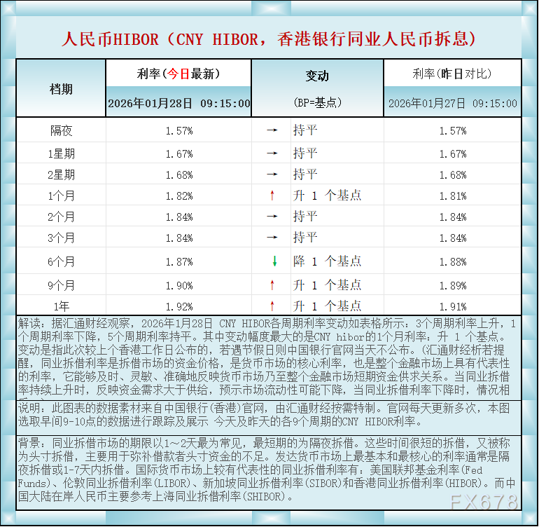 汇通财经APP讯——人民币香港银行间同业拆借利率(CNY HIBOR)及变动一览:2026年1月28日据汇通财经观察,2026年1月28日 CNY HIBOR各周期利率变动如表格所示:3个周期利率上升,1个周期利率下降,5个周期利率持平。其中变动幅度最大的是CNY hibor的1个月利率:升 1 个基点。如图更新的数据显示,隔夜在岸人民币HIBOR报1.57%,持平;1星期报1.67%,持平,2星期报1.68%,持平,1个月报1.82%,升1个基点,2个月报1.84%,持平,3个月报1.84%,持平,6个月报1.87%,降1个基点,9个月报1.90%,升1个基点,1年在岸人民币HIBOR报1.92%,升1个基点 。BP=基点