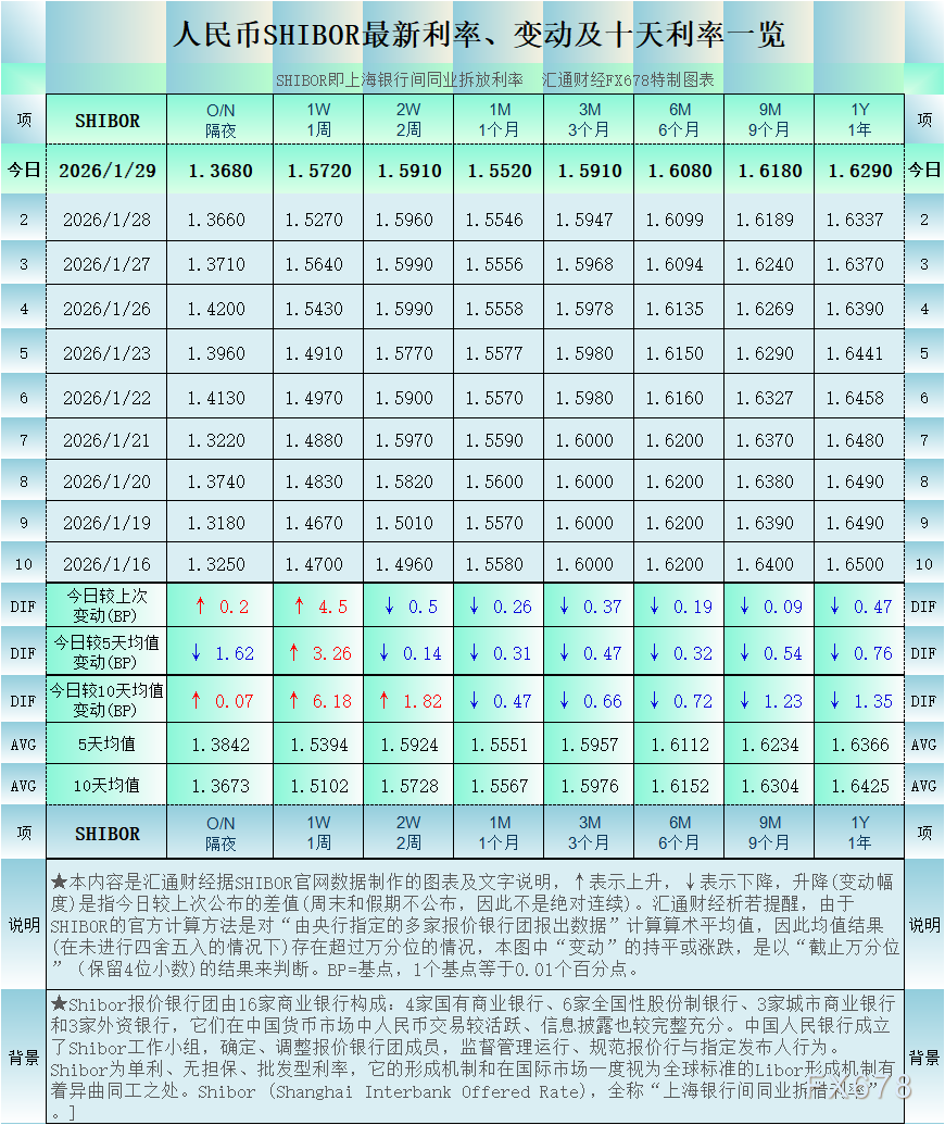 汇通财经APP讯——人民币SHIBOR(上海银行间同业拆放利率):2026年1月29日最新数据,6个周期利率下降,2个周期利率上升,其中,隔夜Shibor报1.368%,升0.2个基点。各周期“变动幅度最大”的是人民币SHIBOR的1周利率:升4.5个基点。(最近十个工作日SHIBOR及变动详见汇通FX678特制图);其他周期显示,1周Shibor报1.572%,升4.5个基点。2周Shibor报1.591%,降0.5个基点。1个月Shibor报1.552%,降0.26个基点。3个月Shibor报1.591%,降0.37个基点。6个月Shibor报1.608%,降0.19个基点。9个月Shibor报1.618%,降0.09个基点。一年Shibor报1.629%,降0.47个基点。