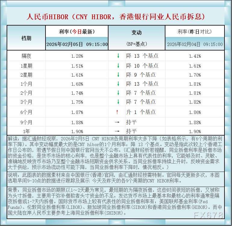 汇通财经APP讯——人民币香港银行间同业拆借利率(CNY HIBOR)及变动一览:2026年2月5日据汇通财经观察,2026年2月5日 CNY HIBOR各周期利率大多下降(如表格所示,有6个周期的利率下降)。其中变动幅度最大的是CNY hibor的1个月利率:降 13 个基点。如图更新的数据显示,隔夜在岸人民币HIBOR报1.28%,降13个基点;1星期报1.51%,降10个基点,2星期报1.61%,降9个基点,1个月报1.68%,降13个基点,2个月报1.74%,降7个基点,3个月报1.75%,降7个基点,6个月报1.87%,升1个基点,9个月报1.88%,持平,1年在岸人民币HIBOR报1.90%,持平 。BP=基点