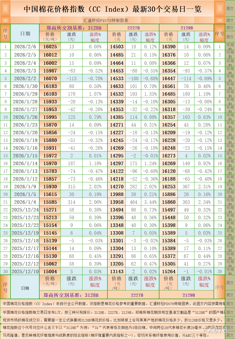 汇通财经APP讯——一张图:中国棉花价格指数(CC Index)最新(2026年2月6日)数据显示,3128B棉花价格指数报 16025 元/吨(3128B是郑商所棉花期货交割认定的基准),上升13元/吨,涨0.08%,另外,2227B棉花价格指数报 14503 元/吨,上升18元/吨,涨0.12%,2129B棉花价格指数报 16390 元/吨,上升14元/吨,涨0.09%。汇通财经FX678特制图表为您展示:中国棉花价格指数(CC Index)最新30个交易日一览。( 中国棉花价格指数每交易日发布1次,按三种分别报价:3128B、2227B、2129B。郑商所棉花期货规定基准交割品是“3128B”的国产棉花。 现货市场的棉花成交价,需要据一定公式换算成3128B棉花的价格。比如研报上会写某某产地的棉花价格多少,折3128B价格又是多少。)