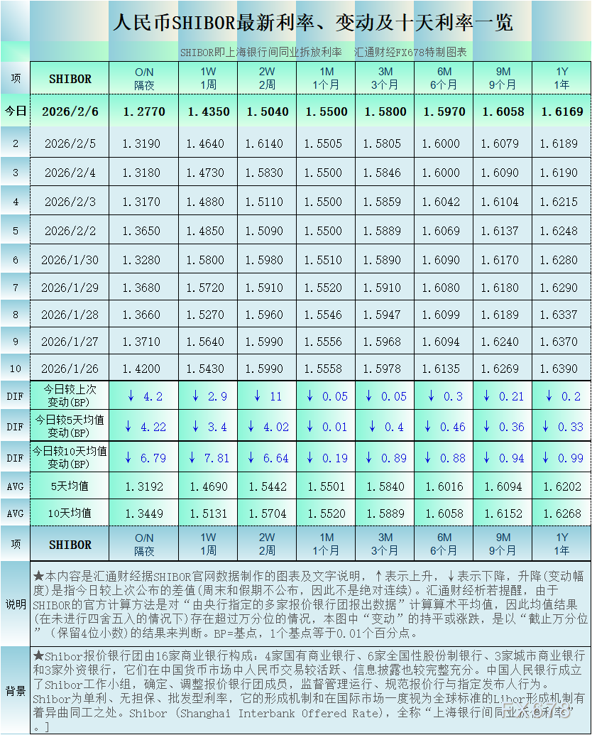 汇通财经APP讯——人民币SHIBOR(上海银行间同业拆放利率):2026年2月6日最新数据,8个周期利率下降,其中,隔夜Shibor报1.277%,降4.2个基点。各周期“变动幅度最大”的是人民币SHIBOR的2周利率:降11个基点。(最近十个工作日SHIBOR及变动详见汇通FX678特制图);其他周期显示,1周Shibor报1.435%,降2.9个基点。2周Shibor报1.504%,降11个基点。1个月Shibor报1.55%,降0.05个基点。3个月Shibor报1.58%,降0.05个基点。6个月Shibor报1.597%,降0.3个基点。9个月Shibor报1.6058%,降0.21个基点。一年Shibor报1.6169%,降0.2个基点。