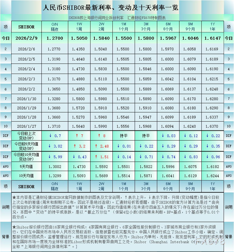 汇通财经APP讯——人民币SHIBOR(上海银行间同业拆放利率):2026年2月9日最新数据,4个周期利率下降,2个周期利率上升,2个周期利率持平,其中,隔夜Shibor报1.27%,降0.7个基点。各周期“变动幅度最大”的是人民币SHIBOR的2周利率:升8个基点。(最近十个工作日SHIBOR及变动详见汇通FX678特制图);其他周期显示,1周Shibor报1.505%,升7个基点。2周Shibor报1.584%,升8个基点。1个月Shibor报1.55%,持平。3个月Shibor报1.58%,持平。6个月Shibor报1.5967%,降0.03个基点。9个月Shibor报1.6046%,降0.12个基点。一年Shibor报1.6147%,降0.22个基点