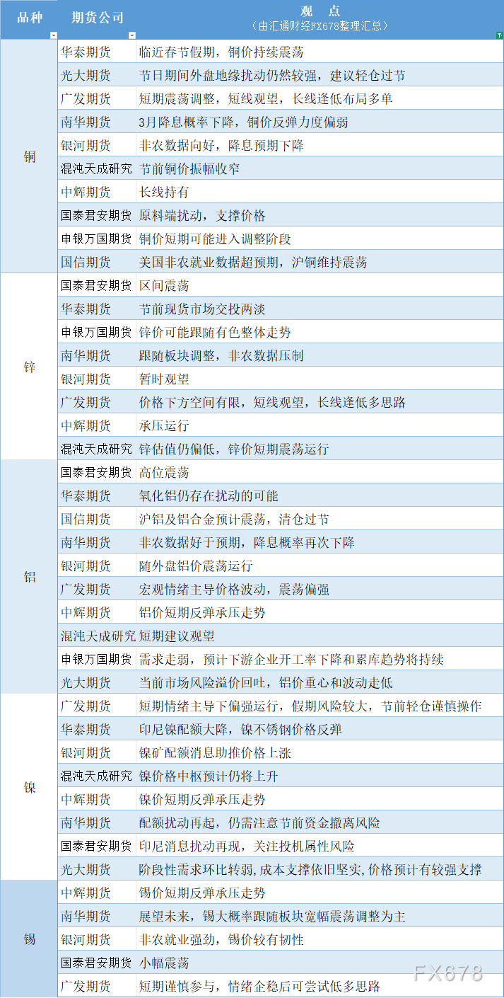 期货公司观点汇总一张图:2月12日有色系(铜、锌、铝、镍、锡等)