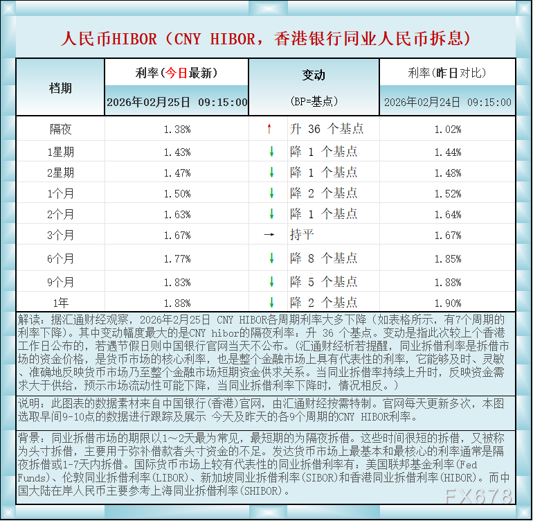 汇通财经APP讯——人民币香港银行间同业拆借利率(CNY HIBOR)及变动一览:2026年2月25日据汇通财经观察,2026年2月25日 CNY HIBOR各周期利率大多下降(如表格所示,有7个周期的利率下降)。其中变动幅度最大的是CNY hibor的隔夜利率:升 36 个基点。如图更新的数据显示,隔夜在岸人民币HIBOR报1.38%,升36个基点;1星期报1.43%,降1个基点,2星期报1.47%,降1个基点,1个月报1.50%,降2个基点,2个月报1.63%,降1个基点,3个月报1.67%,持平,6个月报1.77%,降8个基点,9个月报1.83%,降5个基点,1年在岸人民币HIBOR报1.88%,降2个基点 。BP=基点