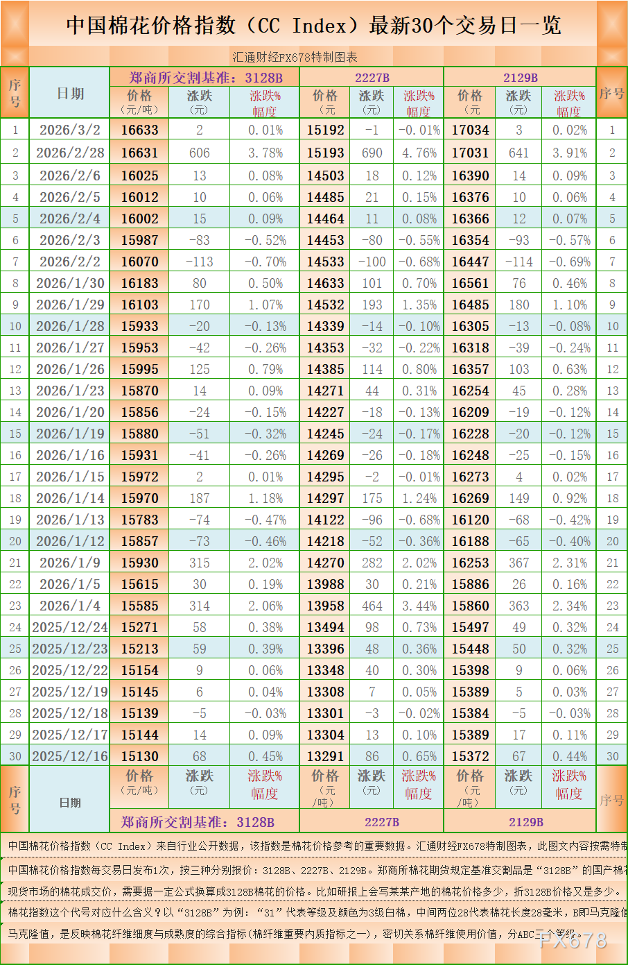 汇通财经APP讯——一张图:中国棉花价格指数(CC Index)最新(2026年3月2日)数据显示,3128B棉花价格指数报 16633 元/吨(3128B是郑商所棉花期货交割认定的基准),上升2元/吨,涨0.01%,另外,2227B棉花价格指数报 15192 元/吨,下降1元/吨,跌0.01%,2129B棉花价格指数报 17034 元/吨,上升3元/吨,涨0.02%。汇通财经FX678特制图表为您展示:中国棉花价格指数(CC Index)最新30个交易日一览。( 中国棉花价格指数每交易日发布1次,按三种分别报价:3128B、2227B、2129B。郑商所棉花期货规定基准交割品是“3128B”的国产棉花。 现货市场的棉花成交价,需要据一定公式换算成3128B棉花的价格。比如研报上会写某某产地的棉花价格多少,折3128B价格又是多少。)