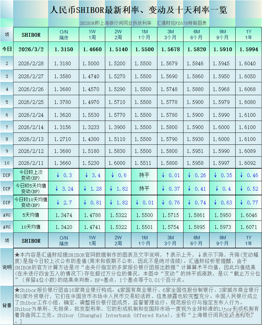汇通财经APP讯——人民币SHIBOR(上海银行间同业拆放利率):2026年3月2日最新数据,7个周期利率下降,1个周期利率持平,其中,隔夜Shibor报1.315%,降0.3个基点。各周期“变动幅度最大”的是人民币SHIBOR的1周利率:降3.4个基点。(最近十个工作日SHIBOR及变动详见汇通FX678特制图);其他周期显示,1周Shibor报1.466%,降3.4个基点。2周Shibor报1.514%,降0.6个基点。1个月Shibor报1.55%,持平。3个月Shibor报1.5678%,降0.01个基点。6个月Shibor报1.582%,降0.26个基点。9个月Shibor报1.591%,降0.35个基点。一年Shibor报1.5994%,降0.46个基点。