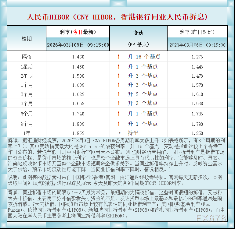 汇通财经APP讯——人民币香港银行间同业拆借利率(CNY HIBOR)及变动一览:2026年3月9日据汇通财经观察,2026年3月9日 CNY HIBOR各周期利率大多上升(如表格所示,有8个周期的利率上升)。其中变动幅度最大的是CNY hibor的隔夜利率:升 16 个基点。如图更新的数据显示,隔夜在岸人民币HIBOR报1.43%,升16个基点;1星期报1.45%,升1个基点,2星期报1.50%,升3个基点,1个月报1.60%,升3个基点,2个月报1.63%,升2个基点,3个月报1.66%,升3个基点,6个月报1.74%,升1个基点,9个月报1.80%,升1个基点,1年在岸人民币HIBOR报1.85%,持平 。BP=基点