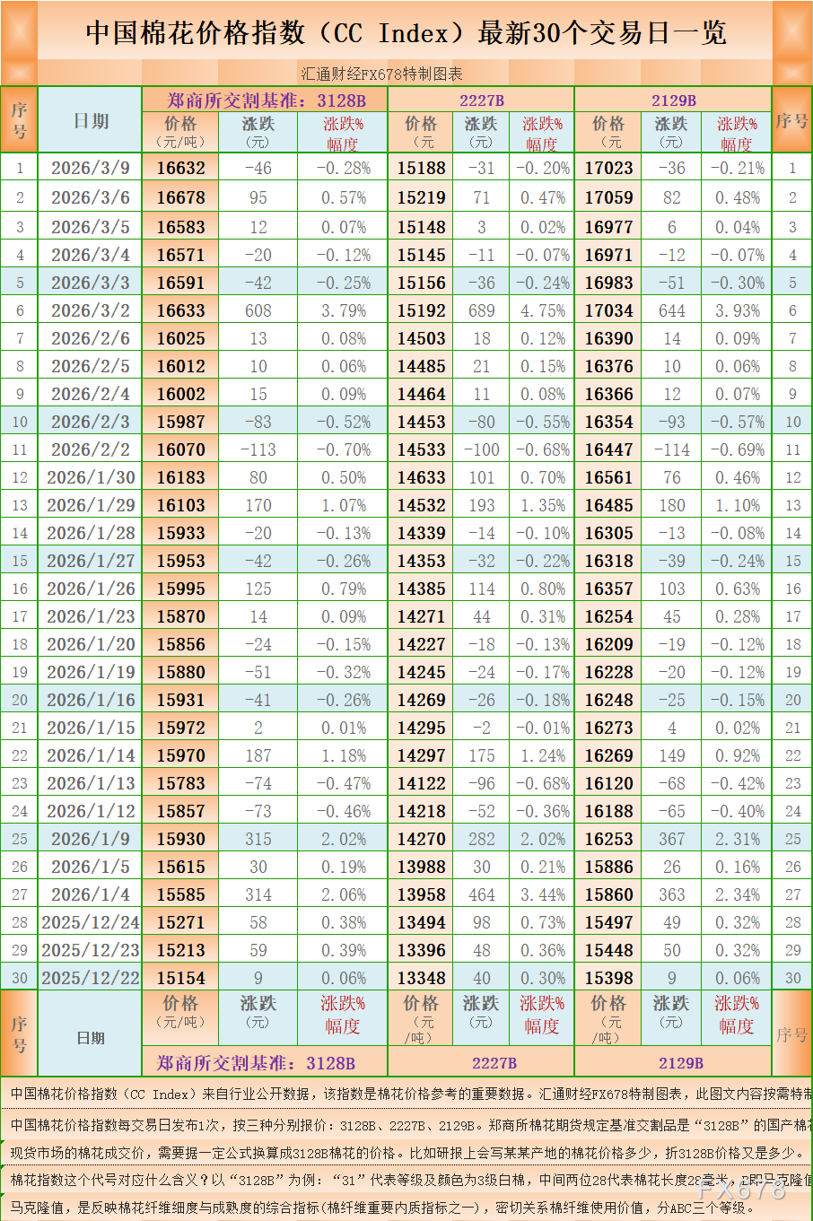 汇通财经APP讯——一张图:中国棉花价格指数(CC Index)最新(2026年3月9日)数据显示,3128B棉花价格指数报 16632 元/吨(3128B是郑商所棉花期货交割认定的基准),下降46元/吨,跌0.28%,另外,2227B棉花价格指数报 15188 元/吨,下降31元/吨,跌0.20%,2129B棉花价格指数报 17023 元/吨,下降36元/吨,跌0.21%。汇通财经FX678特制图表为您展示:中国棉花价格指数(CC Index)最新30个交易日一览。( 中国棉花价格指数每交易日发布1次,按三种分别报价:3128B、2227B、2129B。郑商所棉花期货规定基准交割品是“3128B”的国产棉花。 现货市场的棉花成交价,需要据一定公式换算成3128B棉花的价格。比如研报上会写某某产地的棉花价格多少,折3128B价格又是多少。)