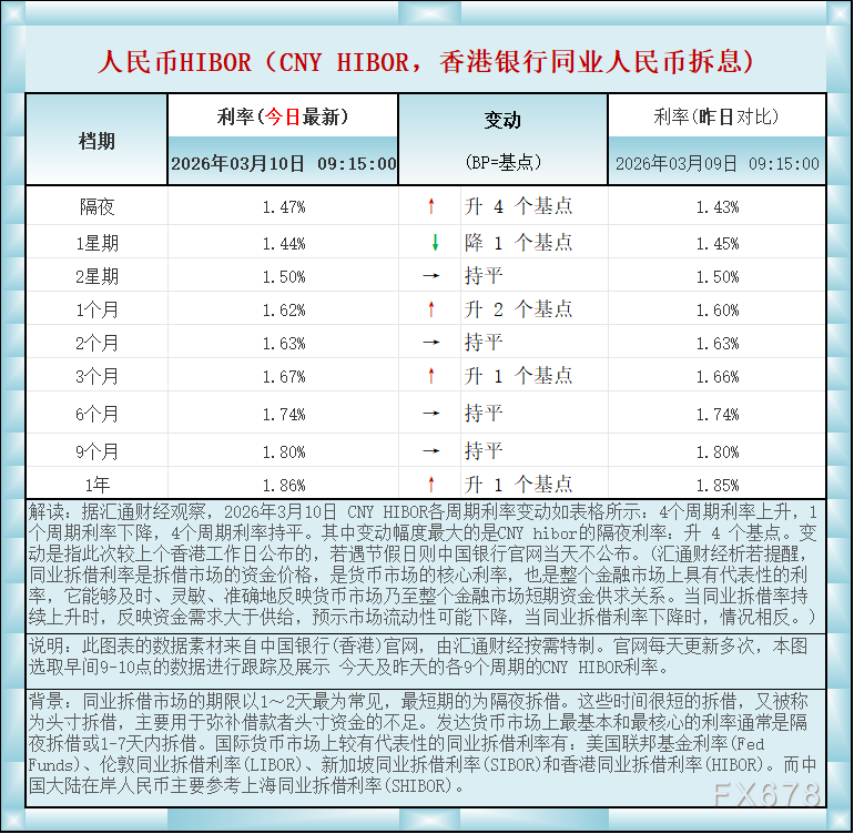 汇通财经APP讯——人民币香港银行间同业拆借利率(CNY HIBOR)及变动一览:2026年3月10日据汇通财经观察,2026年3月10日 CNY HIBOR各周期利率变动如表格所示:4个周期利率上升,1个周期利率下降,4个周期利率持平。其中变动幅度最大的是CNY hibor的隔夜利率:升 4 个基点。如图更新的数据显示,隔夜在岸人民币HIBOR报1.47%,升4个基点;1星期报1.44%,降1个基点,2星期报1.50%,持平,1个月报1.62%,升2个基点,2个月报1.63%,持平,3个月报1.67%,升1个基点,6个月报1.74%,持平,9个月报1.80%,持平,1年在岸人民币HIBOR报1.86%,升1个基点 。BP=基点