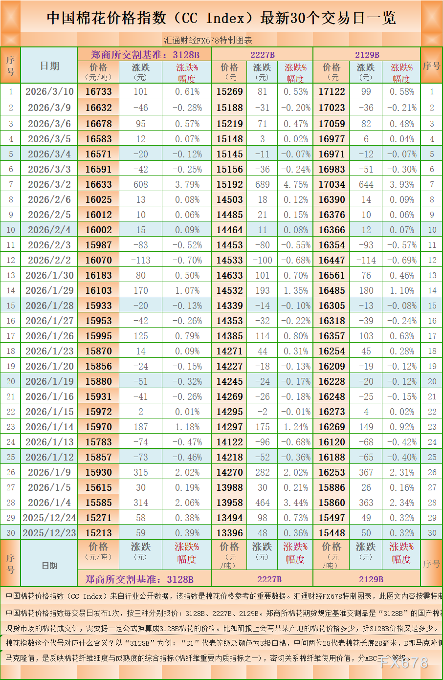 汇通财经APP讯——一张图:中国棉花价格指数(CC Index)最新(2026年3月10日)数据显示,3128B棉花价格指数报 16733 元/吨(3128B是郑商所棉花期货交割认定的基准),上升101元/吨,涨0.61%,另外,2227B棉花价格指数报 15269 元/吨,上升81元/吨,涨0.53%,2129B棉花价格指数报 17122 元/吨,上升99元/吨,涨0.58%。汇通财经FX678特制图表为您展示:中国棉花价格指数(CC Index)最新30个交易日一览。( 中国棉花价格指数每交易日发布1次,按三种分别报价:3128B、2227B、2129B。郑商所棉花期货规定基准交割品是“3128B”的国产棉花。 现货市场的棉花成交价,需要据一定公式换算成3128B棉花的价格。比如研报上会写某某产地的棉花价格多少,折3128B价格又是多少。)